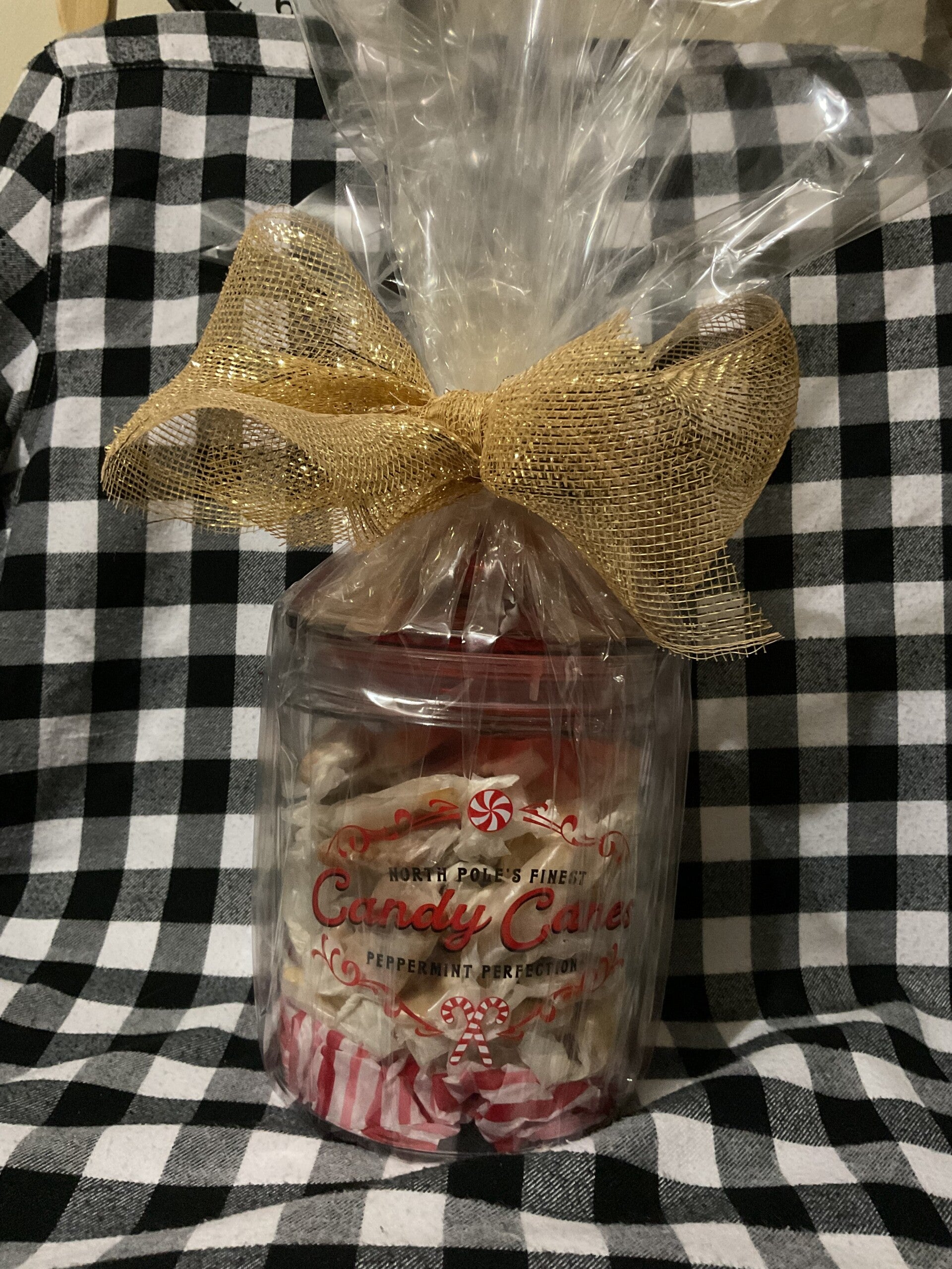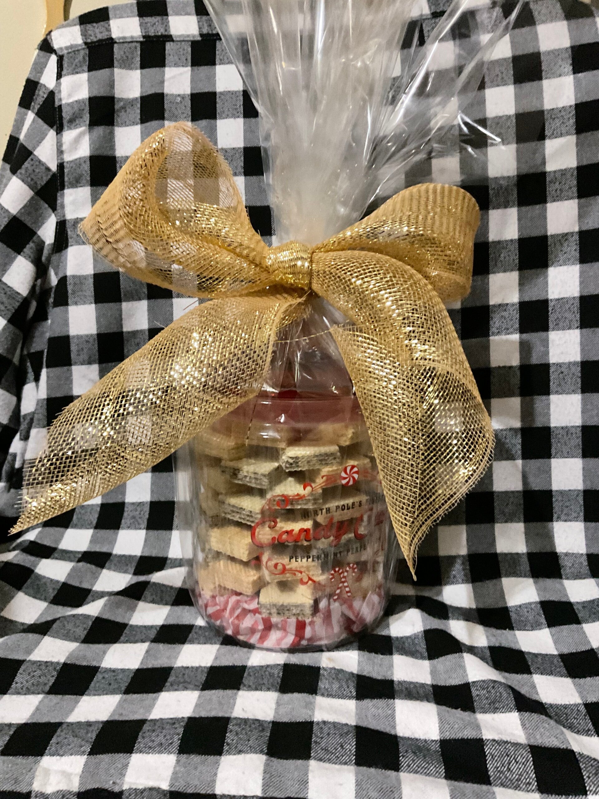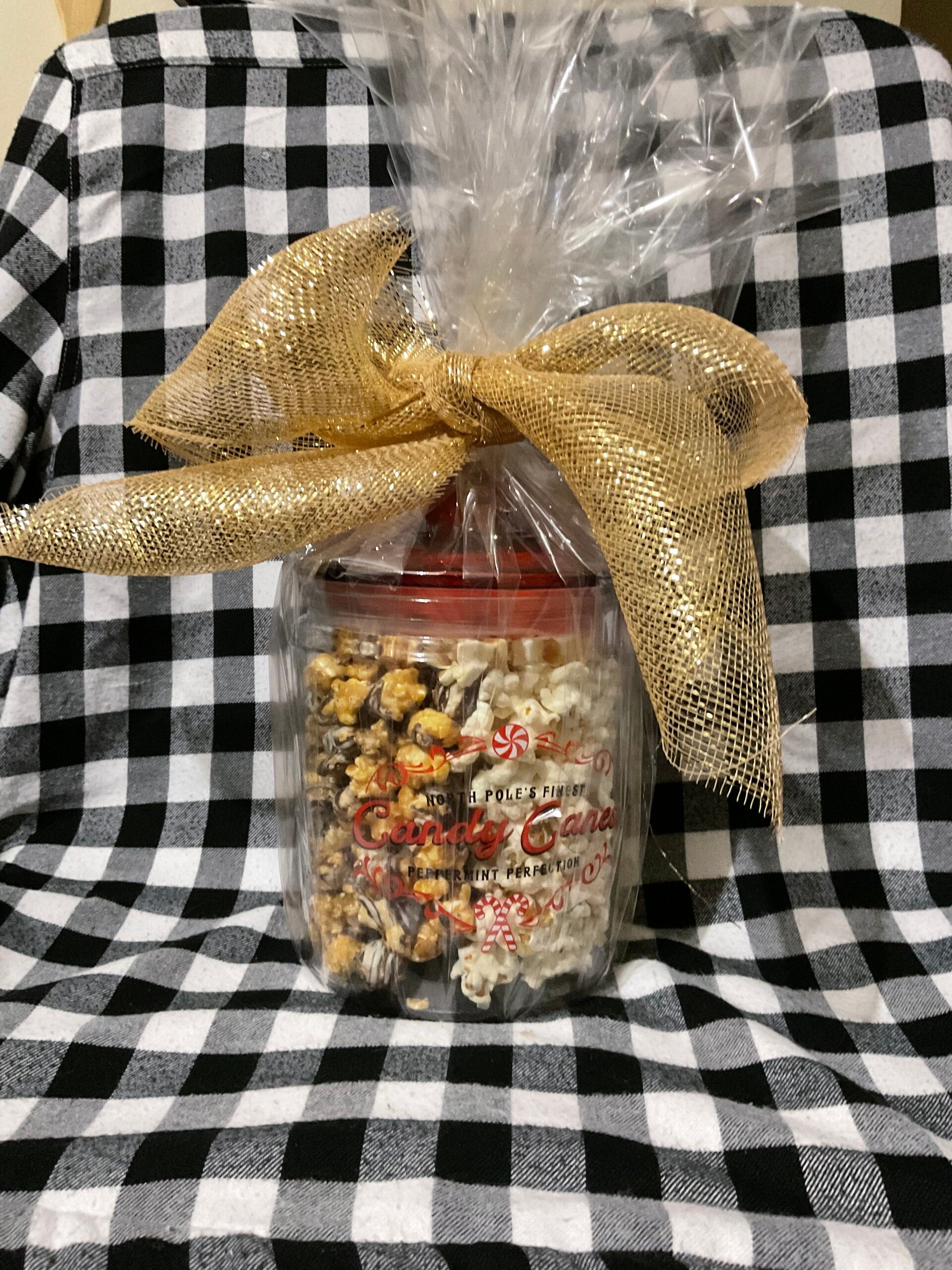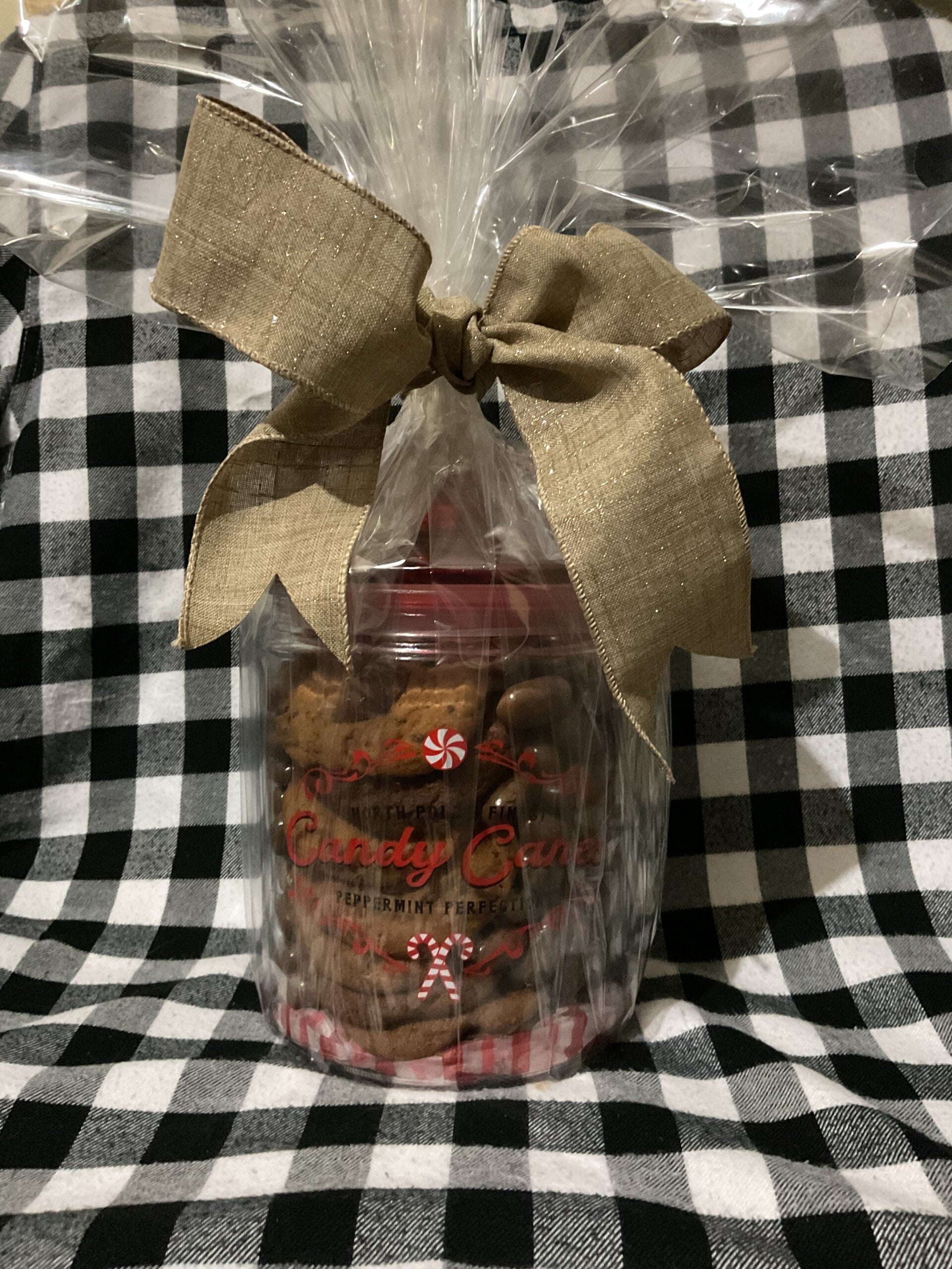 Handmade baked Chocolate chip cookies, Soft caramel chews, Flavored wafer cookies, And homemade caramel popcorn, drizzled in dark and white chocolate. Christmas cookie jars are also customizable. Christmas jars hold about 2 1/2 dozen cookies, 50 caramel candies, or 2 pounds of popcorn. Combination jars may vary in weight due to product and fillers.